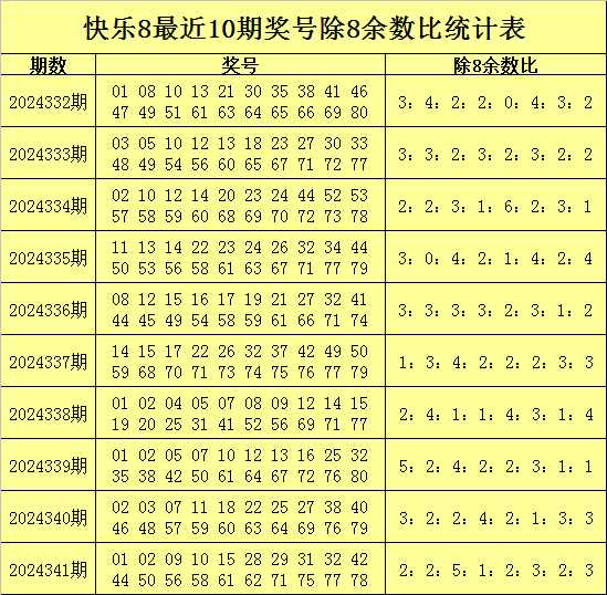 福彩快乐8第2024341期开奖回顾:01 02 09 10 15 28 29 31 32 42 44 50 56 58 61 62 71 75 77 78,其中奖号除8余数比为2:2:5:1:2:3:2:3。