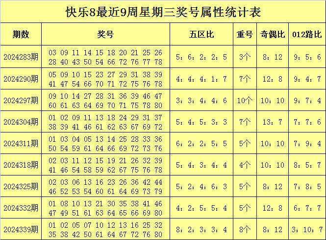 福彩快乐8第2024339期(上周三)奖号回顾:01 02 05 07 10 12 13 16 25 32 35 38 42 50 61 64 67 72 76 80,其中奖号奇偶比为8:12,五区比为8:2:3:3:4,012路比为3:10:7,包含8个重号01、10、13、35、38、61、64、80。