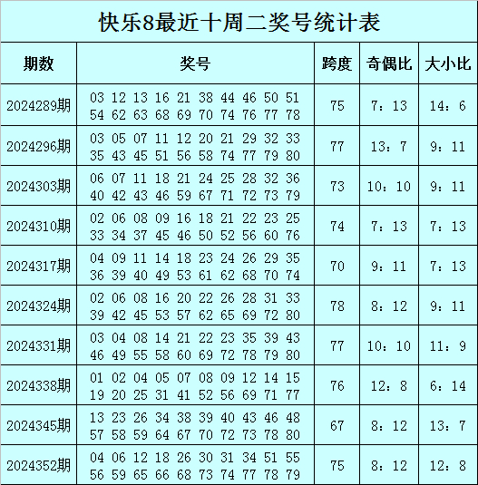 福彩快乐8第2024352期开奖回顾:04 06 12 18 26 30 31 34 51 55 56 59 65 66 68 73 74 77 78 79,其中奖号奇偶比为8:12,大小比为12:8,012路比为7:6:7,首尾间距为75。