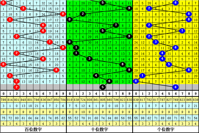 组选分析:在0-9的组选分布图中,最近10期0-2区段开出11个号码,3-6区段开出11个号码,7-9区段开出8个号码,上期7-9区间没有落号,本期重防前端号码热出,注意7-9号码断区。