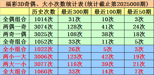 奇偶、大小分析:在最近50期开奖中,全偶组合开出3次,当前遗漏0期、两偶一奇组合开出24次,当前遗漏2期、两奇一偶组合开出18次,当前遗漏1期、全奇组合开出5次,当前遗漏15期,本期注意两偶一奇组合;两大一小组合出现21期,当前轮空3期、全大组合出现7期,当前轮空2期、全小组合出现3期,当前轮空1期、两小一大组合出现19期,当前轮空0期,本期看好开出两大一小组合。