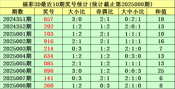 开奖回顾:福彩3D第2025008期奖号为:260。奖号类型为组六,和值为8,奇偶比为0:3,跨度为6,012路比为2:0:1,大小比为1:2。