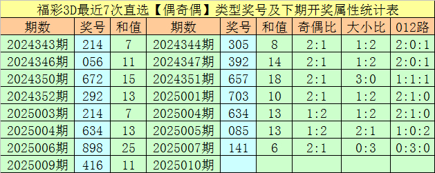 前7次出现偶奇偶类型奖号分别为:214、056、672、292、214、634、898,其下期分别开出奖号:305、392、657、703、634、085、141。