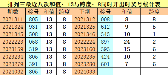 体彩排列三最近八次同时出现和值:13与跨度:8的奖号分别为:805、931、508、058、319、805、391、805,前七次下期开出奖号分别为:008、612、343、897、393、424、601,详见下表: