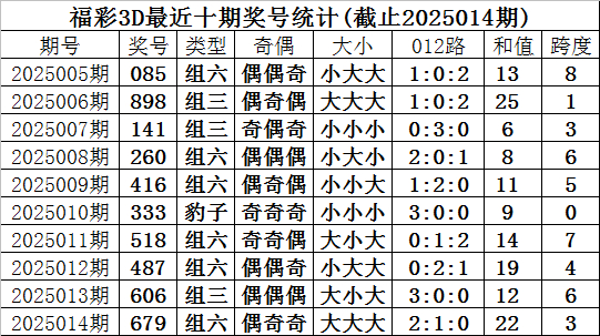开奖回顾:福彩3D第2025014期奖号为679,奖号形态为:组六、大大大、2:1:0、偶奇奇。
