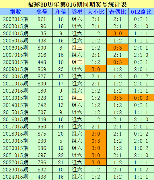 组选类型判断:在第015期历史同期开奖中,组六开出20次,组三开出3次,今年同期防开出组三号码。