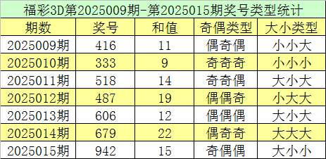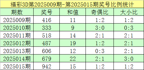 福彩3D第2025015期回顾:奖号为942,奖号奇偶比为1:2,大小比为1:2,和值为15,类型为组六。