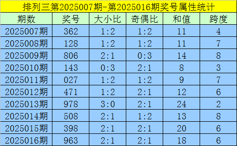 上期回顾:排列三第2025016期出现奖号963。开出组六,奇偶比2:1,012路比3:0:0,大小比2:1,和值18,跨度6。