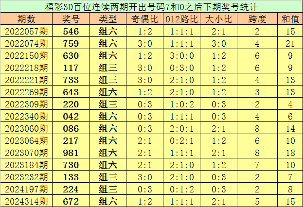 百位号码:连续两期百位出号分别为:7-0,历史上福彩3D连续两期前后分别出号7-0的奖号共出现85次。在百位7-0的奖号现象出现时,近15期下期分别出号:546-759-630-117-733-643-220-042-086-217-981-730-133-224-672;