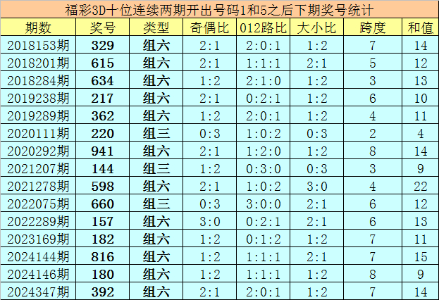 十位号码:前两期十位分别出现奖号1-5,历史上福彩3D连续前后分别开出号码1-5的现象共开出72次。在十位1-5的现象出现时,最近15期其下期分别开出号码:329-615-634-217-362-220-941-144-598-660-157-182-816-180-392;