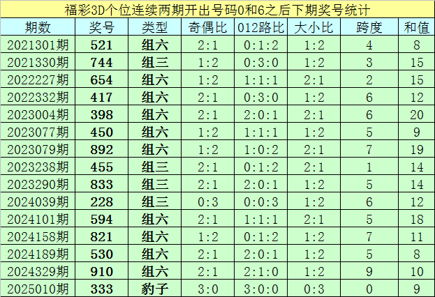 个位号码:最近两期个位开出号码为0-6,在福彩3D历史开奖中,前后两期个位分别开出号码0-6的奖号出现了80次。最近15期个位0-6组合出现之后,其下期奖号分别为:521-744-654-417-398-450-892-455-833-228-594-821-530-910-333;