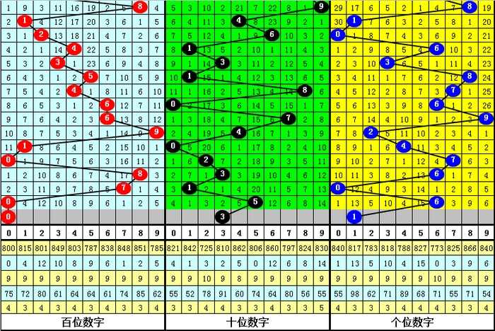其中,百位号码开出奇偶比为22:23,大小比为17:28,本期注意百位出现偶数号码,一码看好0。