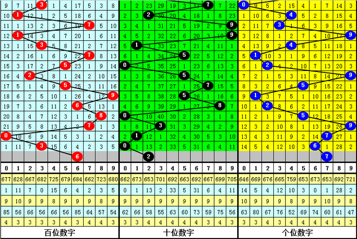 在第036期历史同期开奖中,号码0-9出现频次从高到低分别为:号码0→9次;号码1、5→7次;号码2、3、4、6→6次;号码9→5次;号码7、8→4次。一般来说,表现最热的号码:015+2346中至少出现1个奖号。同时奖号不会全部出现在表现最冷的号码中。
