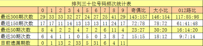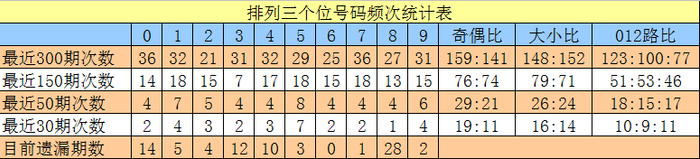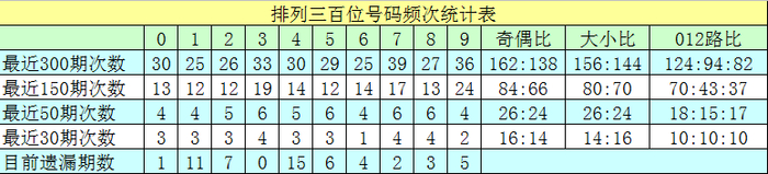 百位号码:前50期走势活跃的号码为:3、5、7、8开出6个;走势最冷的号码为:0、1、6、9开出4个。奖号012路比开出18:15:17,奇偶比开出26:24。本期百位杀排除:1、7,注意号码0、4、8,胆码参考0。