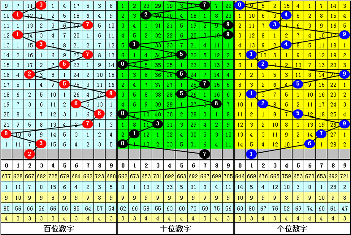 百位走势:近10期在0-9之间出号,跨度为10点,出号比较分散,上期奖号为3,上升3点,本期预计该位走小。另外近10期该位大小比为7:3,小号较冷,本期防小号回补,关注号码2。