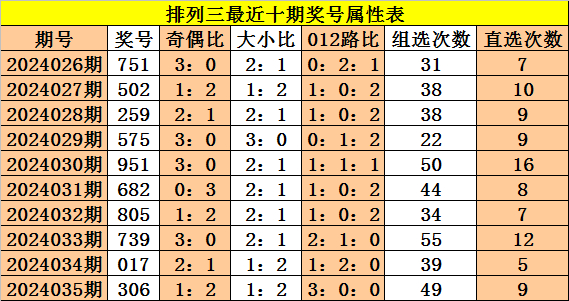 上期回顾:体彩排列三第2024035期奖号:306,奇偶比1:2,大小比1:2,012比3:0:0。
