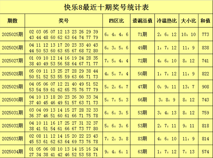 福彩快乐8第2025034期开奖回顾:01 05 06 08 10 13 14 15 16 24 27 34 38 41 42 46 52 53 58 71,其中奖号四区比为9:4:6:1,遗漏总值为63,大小比为7:13,012路比为5:8:7,和值为574。
