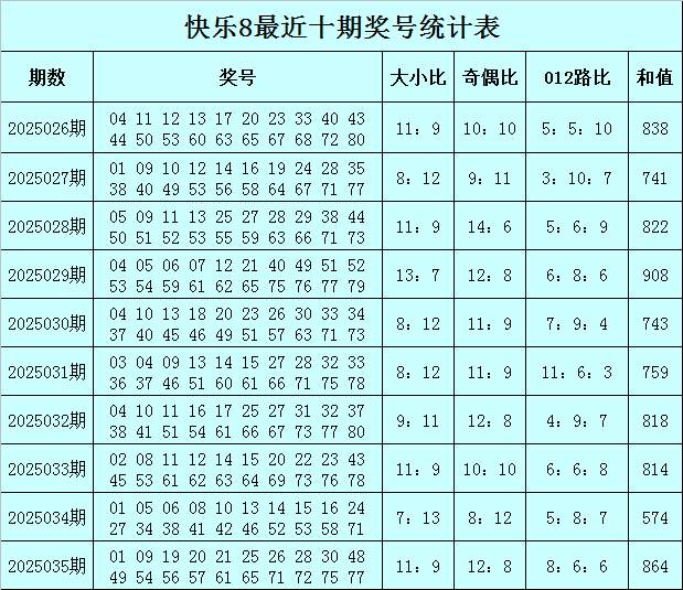 福彩快乐8第2025035期开奖回顾:01 09 19 20 21 25 26 28 30 48 49 54 56 57 61 65 71 72 75 77,其中奖号奇偶比开出12:8,大小比开出11:9,012路比开出8:6:6,和值为864,跨度为76。