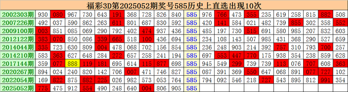 直选号码585历史上开出了10次,其下期分别开出奖号:976、420、485、234、236、697、945、087、794。