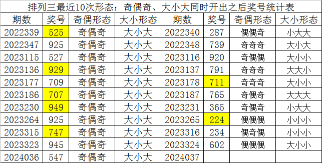 排列三最近10次同时开出奇偶形态:奇偶奇和大小形态:大小大时其奖号分别为:525-925-527-929-709-707-949-925-747-945-547,下期分别开出号码为:287-739-920-791-711-765-365-224-234-602,详细统计见下表: