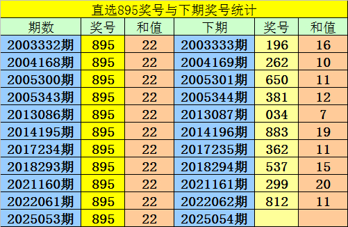 第2025053期3D奖号为:895,历史上该号码直选开出11次,下期号码分别为:196、262、650、381、034、883、362、537、299、812。