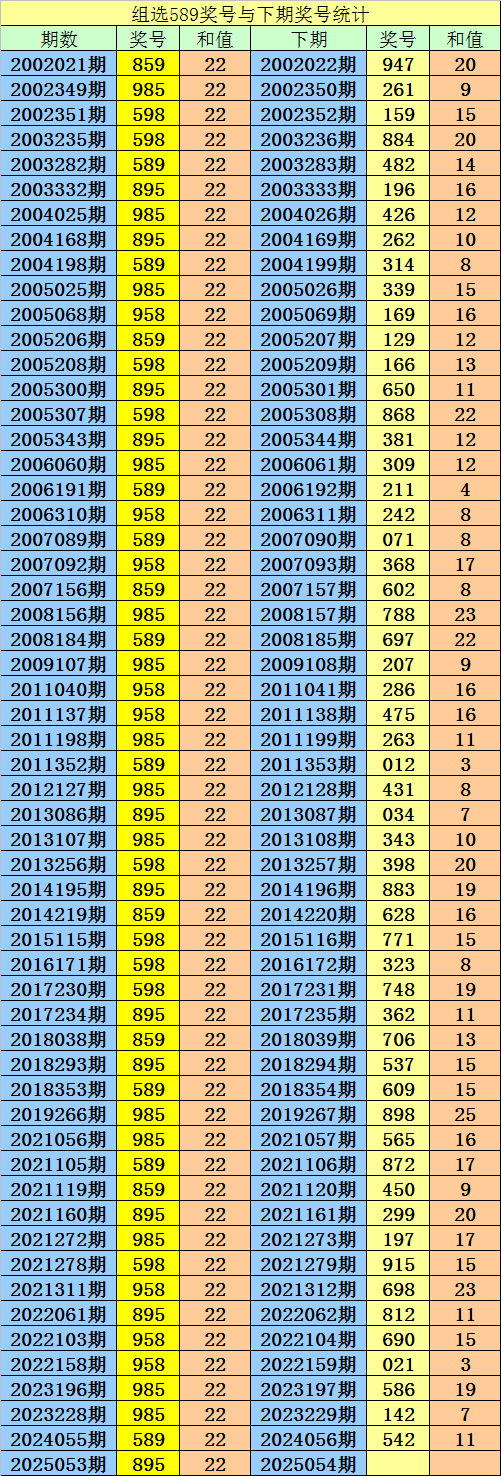 第2025053期3D奖号组选为:589,历史上该号码组选出现57次,下期号码分别为:947、261、159、884、482、196、426、262、314、339、169、129、166、650、868、381、309、211、242、071、368、602、788、697、207、286、475、263、012、431、034、343、398、883、628、771、323、748、362、706、537、609、898、565、872、450、299、197、915、698、812、690、021、586、142、542。