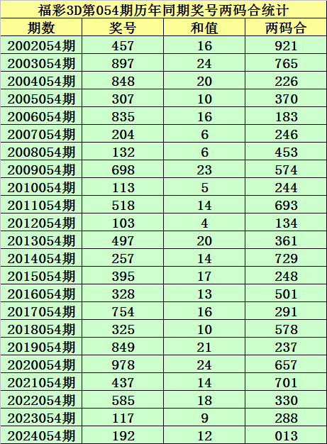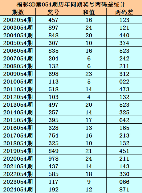福彩3D第054期,历史上期开出23次奖号,其奖号分别为:457、897、848、307、835、204、132、698、113、518、103、497、257、395、328、754、325、849、978、437、585、117、192,奖号两码合差分别开出: