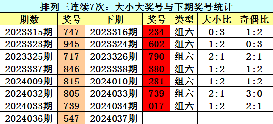 大小判断:上期排列三奖号为547,大小为:大小大,近7次大小为大小大的奖号为:747-945-717-846-815-805-739。