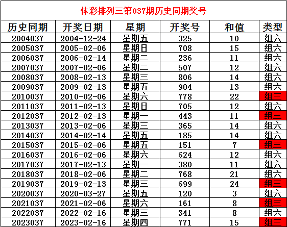 2024年2月6日排列三第037期开奖,历史同期分别开出奖号: