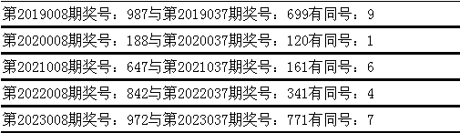 与前期历史同期奖号对比分析,在最近五年开奖中,第008期同期奖号与第037期同期奖号都出现了相同号码: