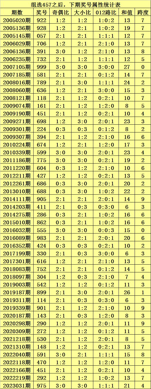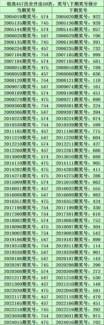 二、组选457分析:排列三历史上已开出50次组选号码457了,其奖号和下期开出奖号统计如下: