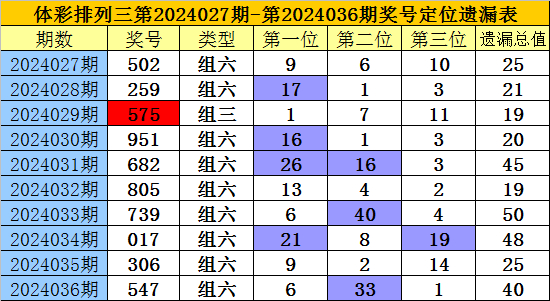 开奖回顾:排列三第2024036期奖号为:547,各位号码遗漏值分别为6、33、1,遗漏总值为40。