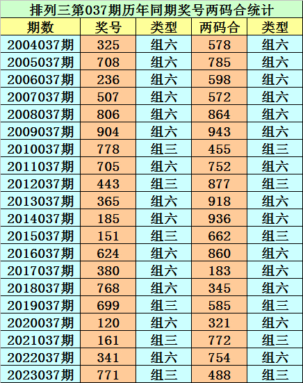 排列三从2004年开奖至今已开出6808期奖号了,其中第037期历史同期奖号出现20次,历年第037期分别开出号码:325、708、236、507、806、904、778、705、443、365、185、151、624、380、768、699、120、161、341、771。