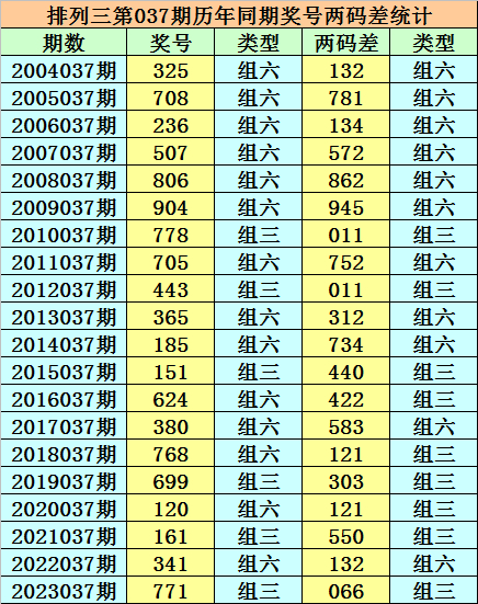 在排列三第037期历史同期开奖中,各号码两码差分别为:123、178、134、257、268、459、011、257、011、123、347、044、224、358、112、033、112、055、123、066;