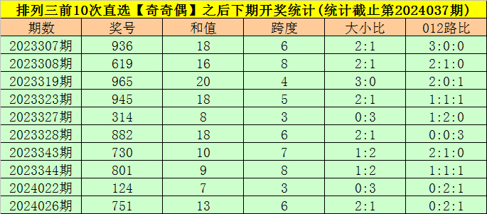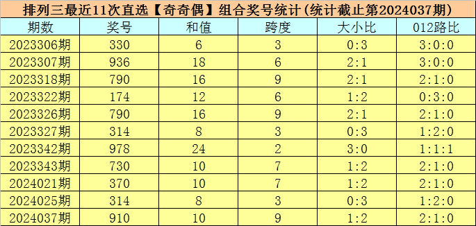 开奖回顾:排列三第2024037期开出奖号:910,类型为组六,和值为10,奇偶比为2:1,大小比为1:2,跨度为9。