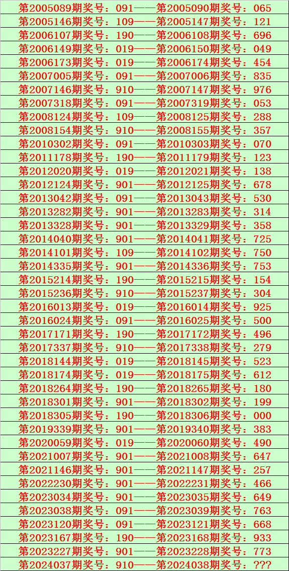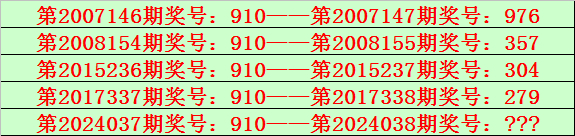 排列三第2024037期开出奖号910,该号码直选类型历史上出现了5次,前4次开出之后期下期奖号为:976、357、304、279,见下表: