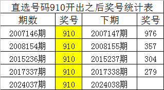 从上表统计可以看出,直选号码910开出之后,其下期奖号:
