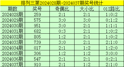 开奖回顾:排列三第2024037期奖号为:910,其奇偶比为2:1,大小比为1:2,奖号012路比为2:1:0。