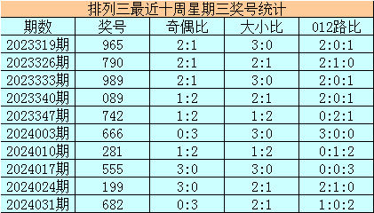 排列三十周星期三分别开出奖号:682、199、555、281、666、742、089、989、790、965,其中号码奇偶比为15:15,奇偶号码出现比例相当;号码大小比为22:8,大号强势走热;号码012路比为14:5:11,1路号码走冷。