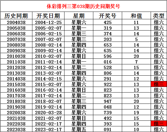 2024年2月7日排列三第038期开奖,历史同期分别开出奖号: