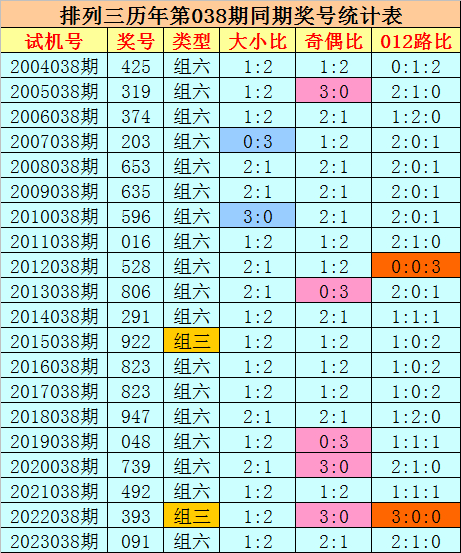 组选类型推荐:历史上排列三第038期同期奖号中,组六出现18期,组三出现2次,今年第038期预计奖号为组六号码。