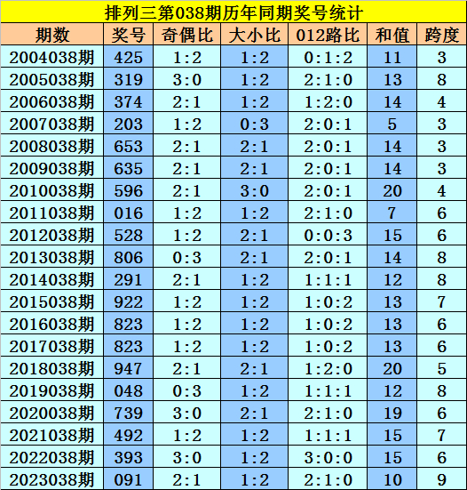 在第038期历史同期开奖中,号码0-9出现频次从高到低分别为:号码3→10次;号码2、9→9次;号码0、4、5、6、8→5次;号码1→4次;号码7→3次。一般来说,表现最热的号码:239+04568中至少出现1个奖号。同时奖号不会全部出现在表现最冷的号码中。