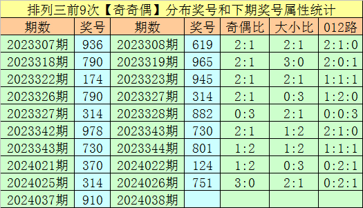 上期回顾:排列三第2024037期开出奖号910,类型为:奇奇偶、010路和大小小。