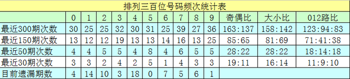 百位号码:前50期走势活跃的号码为:5开出8个,7开出6个,2、3、8、9开出5个;走势最冷的号码为:0、1、4、6开出4个。奖号012路比开出18:14:18,奇偶比开出28:22。本期百位杀排除:0、4,注意号码2、3、7,胆码参考3。