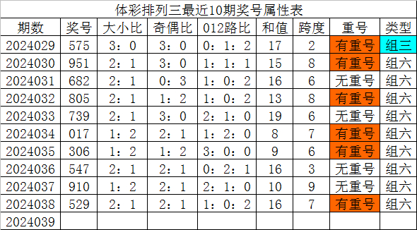 体彩排列三最近10期分别开出奖号:575、951、682、805、739、017、306、547、910、529,各奖号属性详见下表: