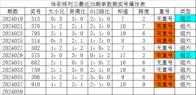 体彩排列三最近20期单数期奖号分别为:313、370、793、314、502、575、682、739、306、910,各期奖号详细属性下表: