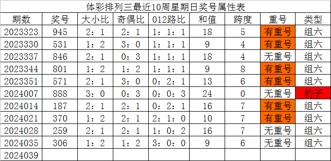 体彩排列三最近10周星期日奖号分别为:945、531、846、801、571、888、187、370、259、306,各奖号属性详见下表: