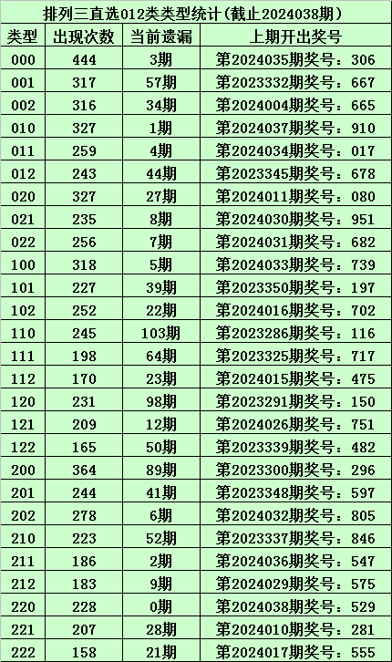 上期回顾:体彩排列三第2024038期开出奖号:529,其012路比为1:0:2,奖号012路类型为:220。
