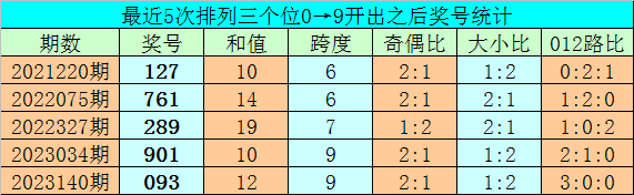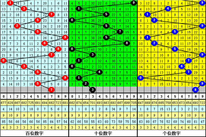 3、在以上0-9号码频次中,号码奇偶比为36:41,大小比为39:38,本期预计百位开出大号,参考号码7。