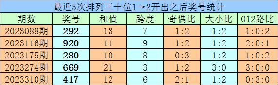 1、最近两期排列三十位号码开出号码分别为1和2,历史上十位号码连续两期同时出现号码1和2的奖号共开出67期。最近五次下期开出号码为:292、920、280、669、417;